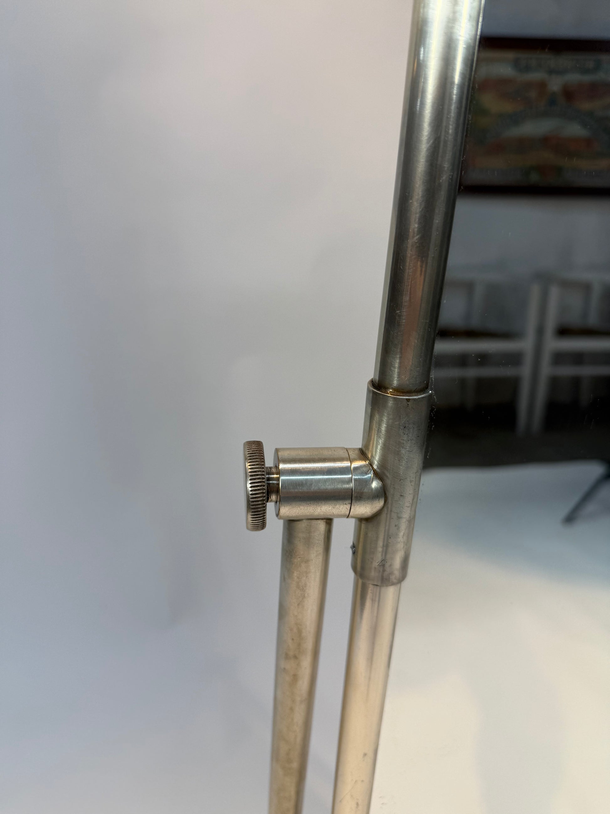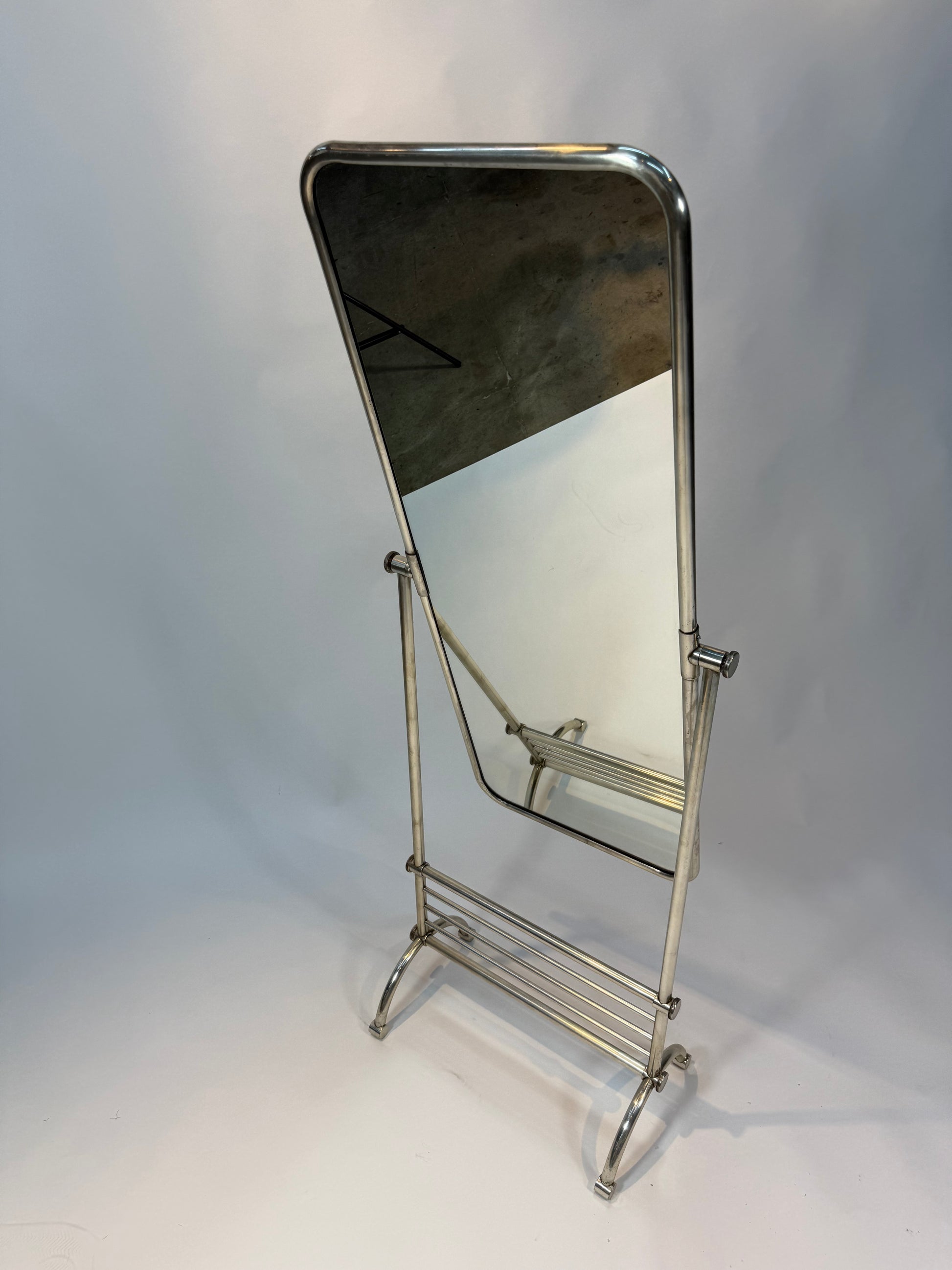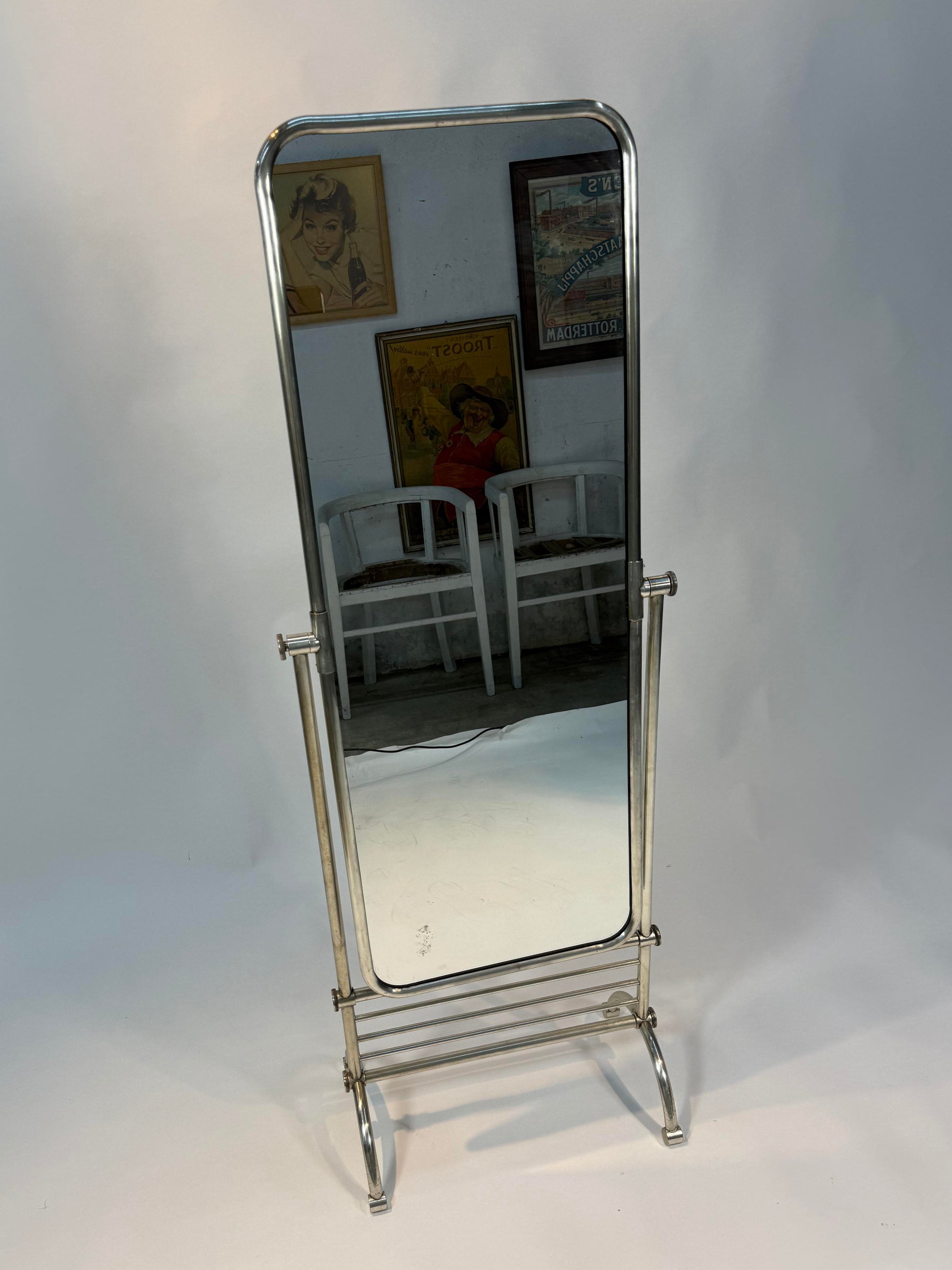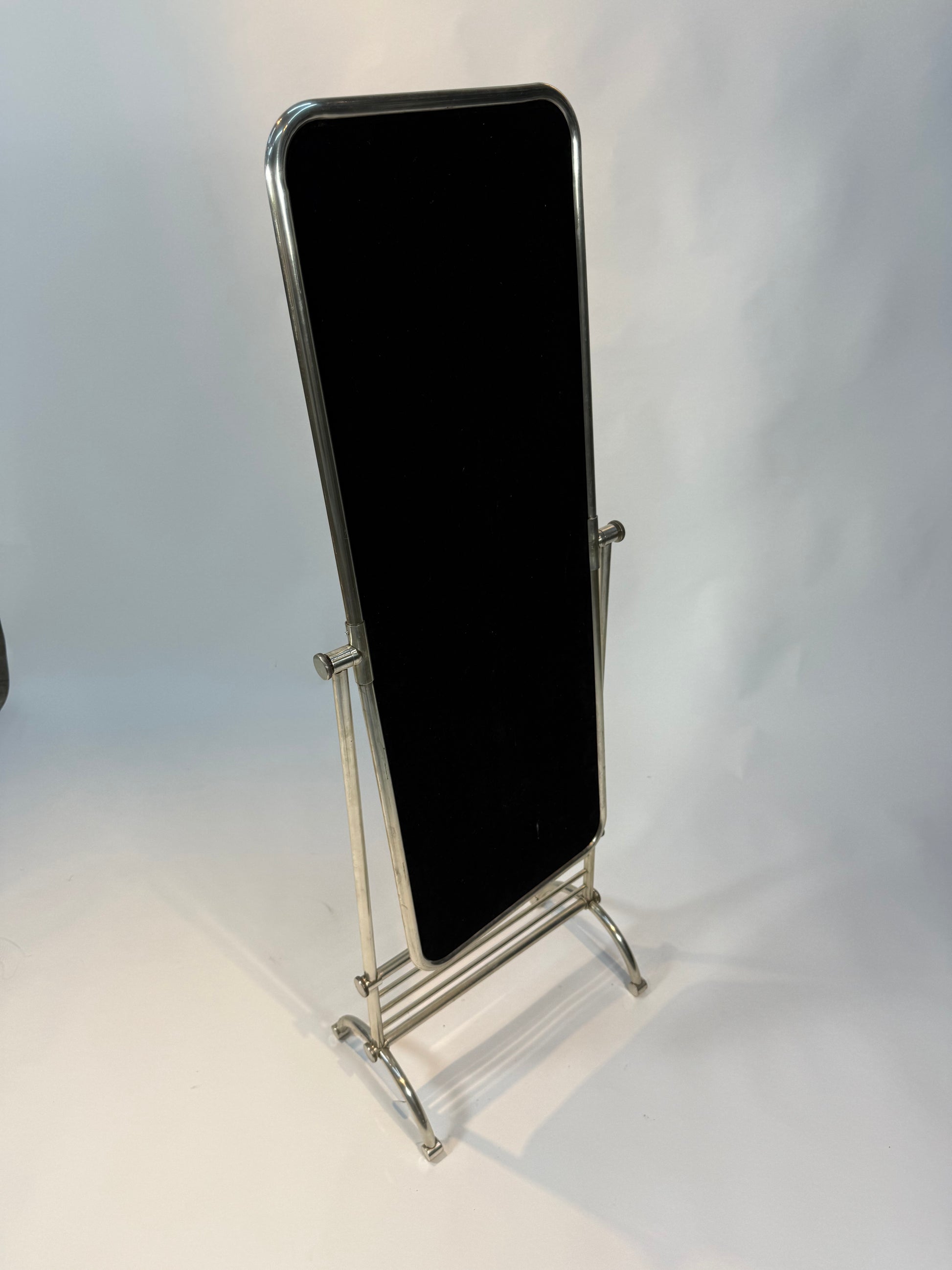 Spiegel in metalen frame, de achterzijde is bekleed met velours.
